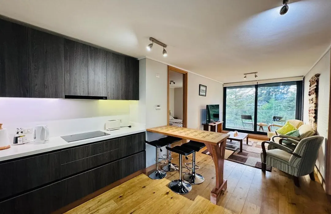 Fornecendo quartos com varanda, sofá e área de estar, este apartamento de 60 m^2 tem vista para montanha. Uma casa de banho dispõe de banheira, casa de banho à parte e chuveiro.